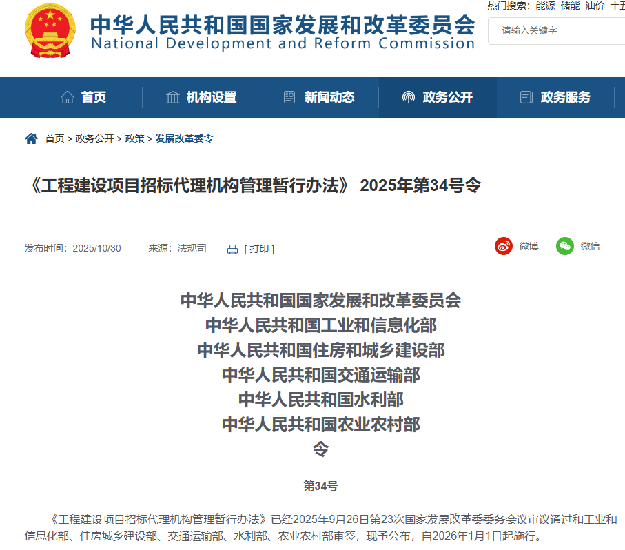 《工程建設(shè)項目招標(biāo)代理機構(gòu)管理暫行辦法》已經(jīng)2025年9月26日第23次國家發(fā)展改革委委務(wù)會議審議通過和工業(yè)和信息化部、住房城鄉(xiāng)建設(shè)部、交通運輸部、水利部、農(nóng)業(yè)農(nóng)村部審簽,現(xiàn)予公布,自2026年1月1日起施行。
